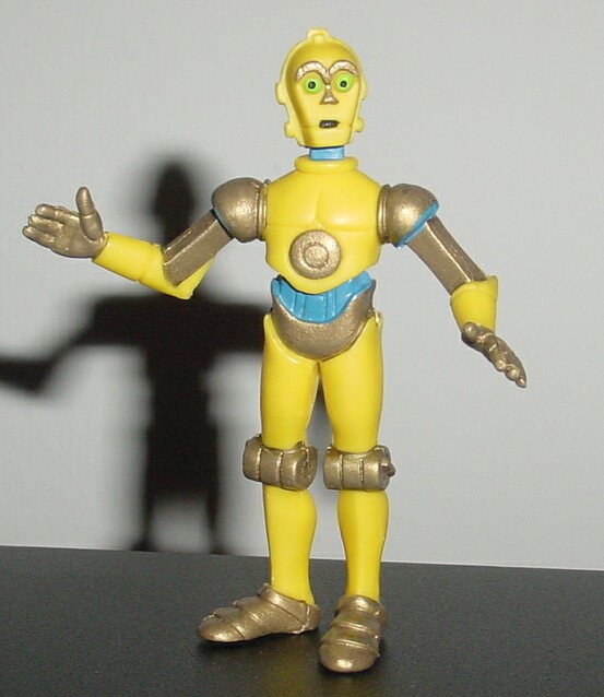 When it comes to variations, the C-3PO figure is the only Comics Spain figure to have a totally repainted variation or running change. The yellow figure, based on the cartoon, was the original design - the company decided to do a running change in the line and later produced an all gold version of C-3PO based on his movie appearance (sans the silver leg). Comics Spain decided to keep the eyes bright green on both versions - which would later come in handy when trying to distinguish the gold version from the Disney / Star Tours version(s).